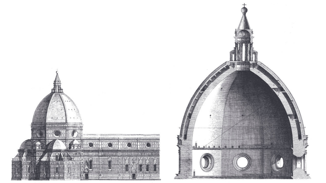 This logic operated at every scale. When Florence faced existential threat from Visconti Milan in the early fifteenth century, thirty-four over-life-size statues of prophets and saints appeared in the heart of the city within the span of three decades3. It was a collective mobilization through visual culture: a city signaling to itself and its enemies that it had the coordination, wealth, and confidence to produce such things while fighting an existential war. Brunelleschi’s dome was the supreme instance. The problem was how to span the 143-foot octagonal crossing of Santa Maria del Fiore without the wooden centering that every previous dome had required4. No architect in Europe had solved it - the Pantheon’s coffered concrete was Roman engineering lost for a thousand years. Brunelleschi invented a self-supporting herringbone brickwork technique, building the dome in concentric rings that held themselves up as they rose. The achievement was engineering, but the message was political and sacred: Florence could solve problems that defeated every other city on the continent while bringing it closer to eternity.