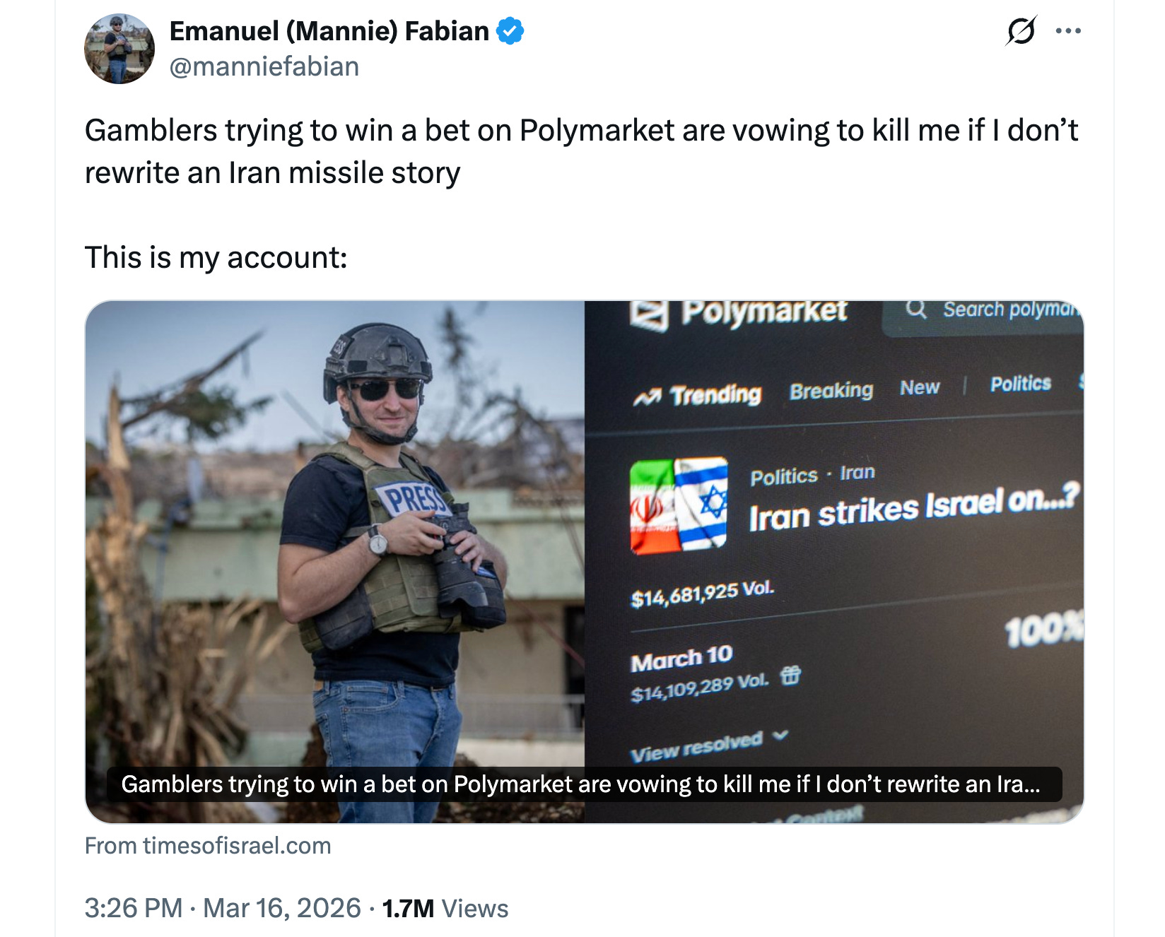 And it is not only games. In March 2026, during the war in the Middle East, when Polymarket let thousands of people bet real money on whether Iranian missiles would strike Israeli territory, a journalist’s choice of words - “debris” rather than “direct hit” - cost bettors enormous sums overnight. Something extraordinary followed: the journalist started getting death threats! From essentially gamblers, over a bet, when he had no relation whatsoever neither to the bet, nor to Polymarket. The journalist had not lied; he had described an ambiguity. But within the market’s simulation, ambiguity is intolerable, because the resolution criteria must be binary and the stakes are denominated in dollars. The bettors were reading his dispatch with the same ferocious precision that a Florentine merchant brought to reading a fresco - except the consequences were financial rather than soteriological. Nobody sends death threats over a Venice Biennale installation. The prediction market recovers, almost by accident, exactly the condition the art world has lost: representation that matters materially, description with consequences, an audience with skin in the game. Nobody calls it art. But then, nobody called Brunelleschi’s dome art either. They called it engineering, civic pride, a problem solved. The word came later, after the coordination function was gone.